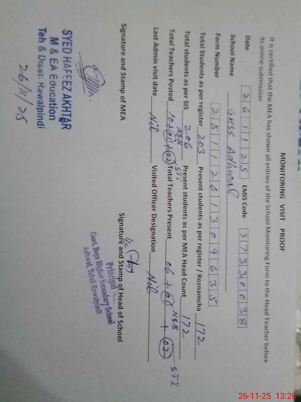 | EMIS Code: 37330038 | Name of School: GHSS ADHWAL RAWALPINDI | |||