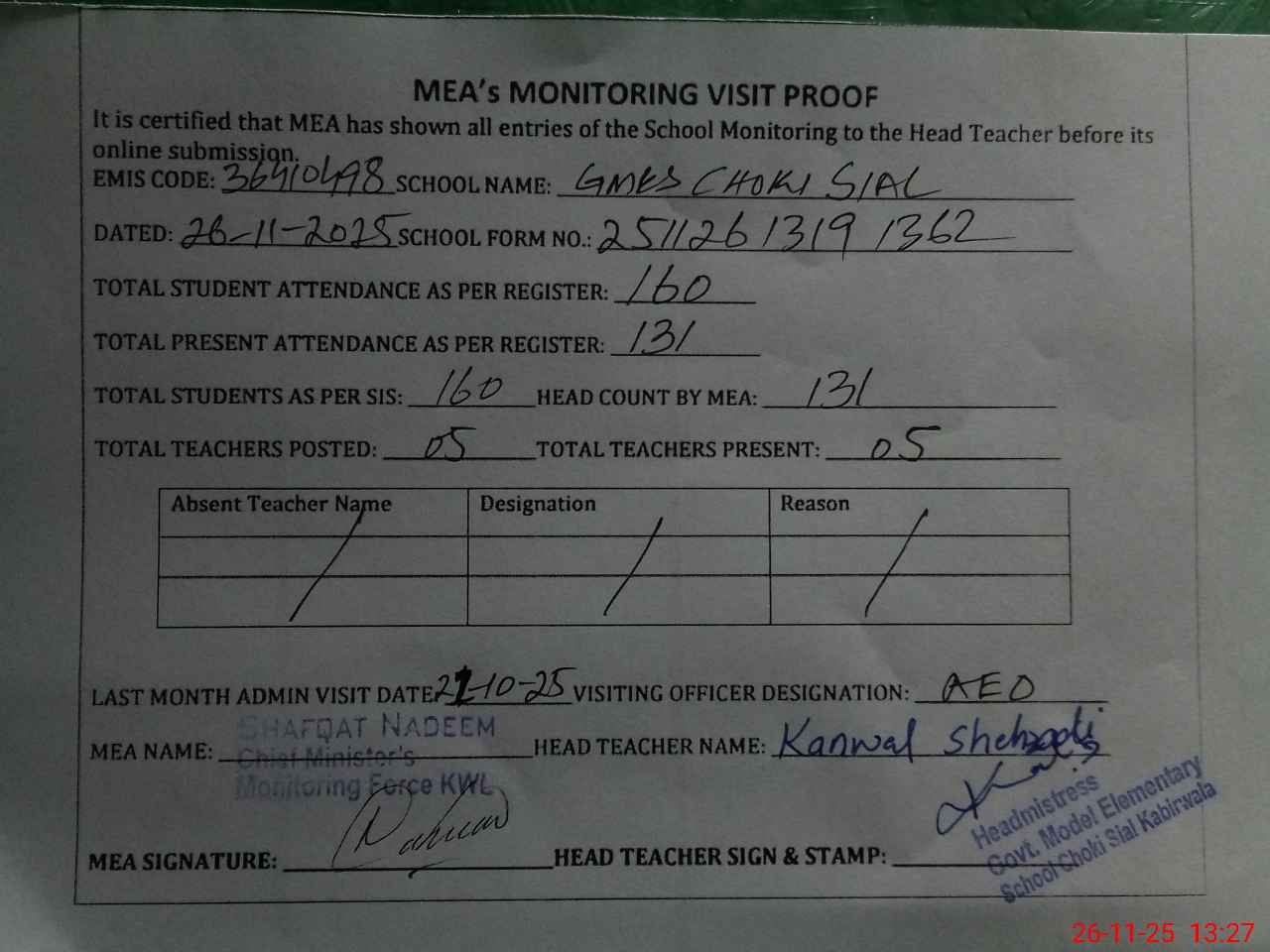 | Attendance Register | Head Teacher | MEA with School | Visit Proof |