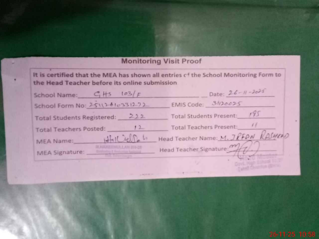 | EMIS Code: 31120025 | Name of School: GHS CHAK NO. 103/F | |||