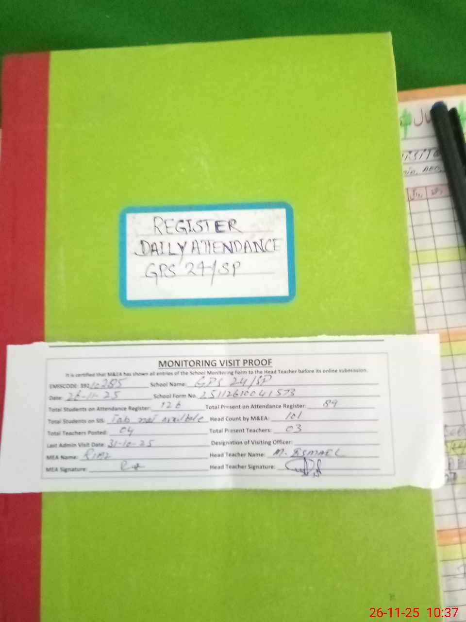 | Attendance Register | Head Teacher | MEA with School | Visit Proof |