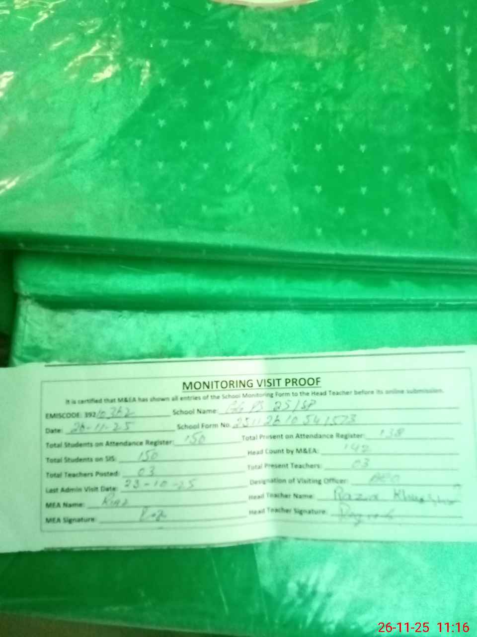 | Attendance Register | Head Teacher | MEA with School | Visit Proof |