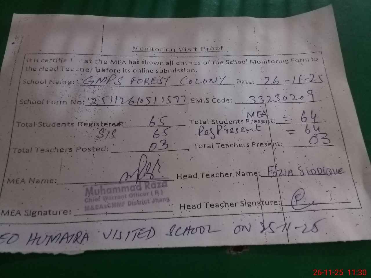 | Certified that this School was Inspected by the Undersigned MEA/DMO Today and the Information Stated Above is as Per Record. | |||||