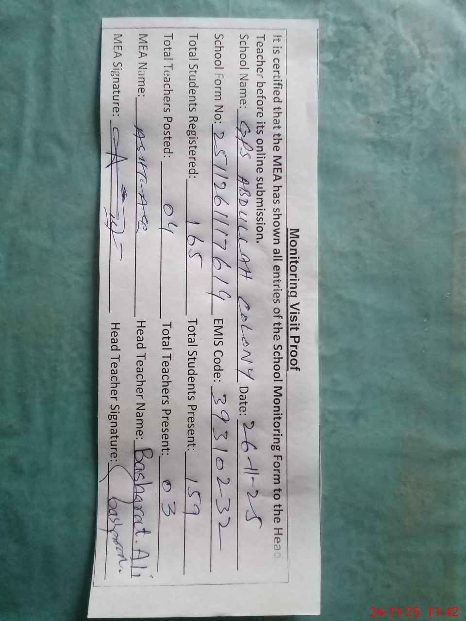 | EMIS Code: 39310232 | Name of School: GPS ABDULLAH COLONY | |||