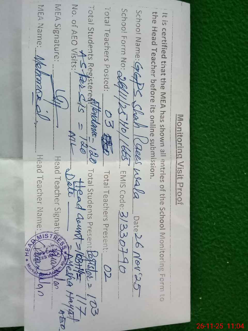 | Attendance Register | Head Teacher | MEA with School | Visit Proof |