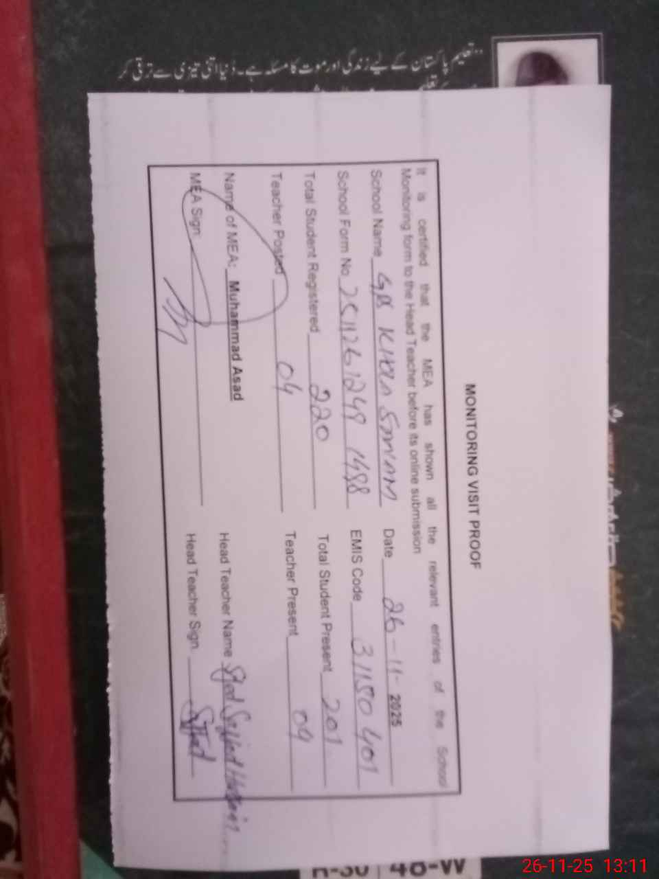 | Attendance Register | Head Teacher | MEA with School | Visit Proof |