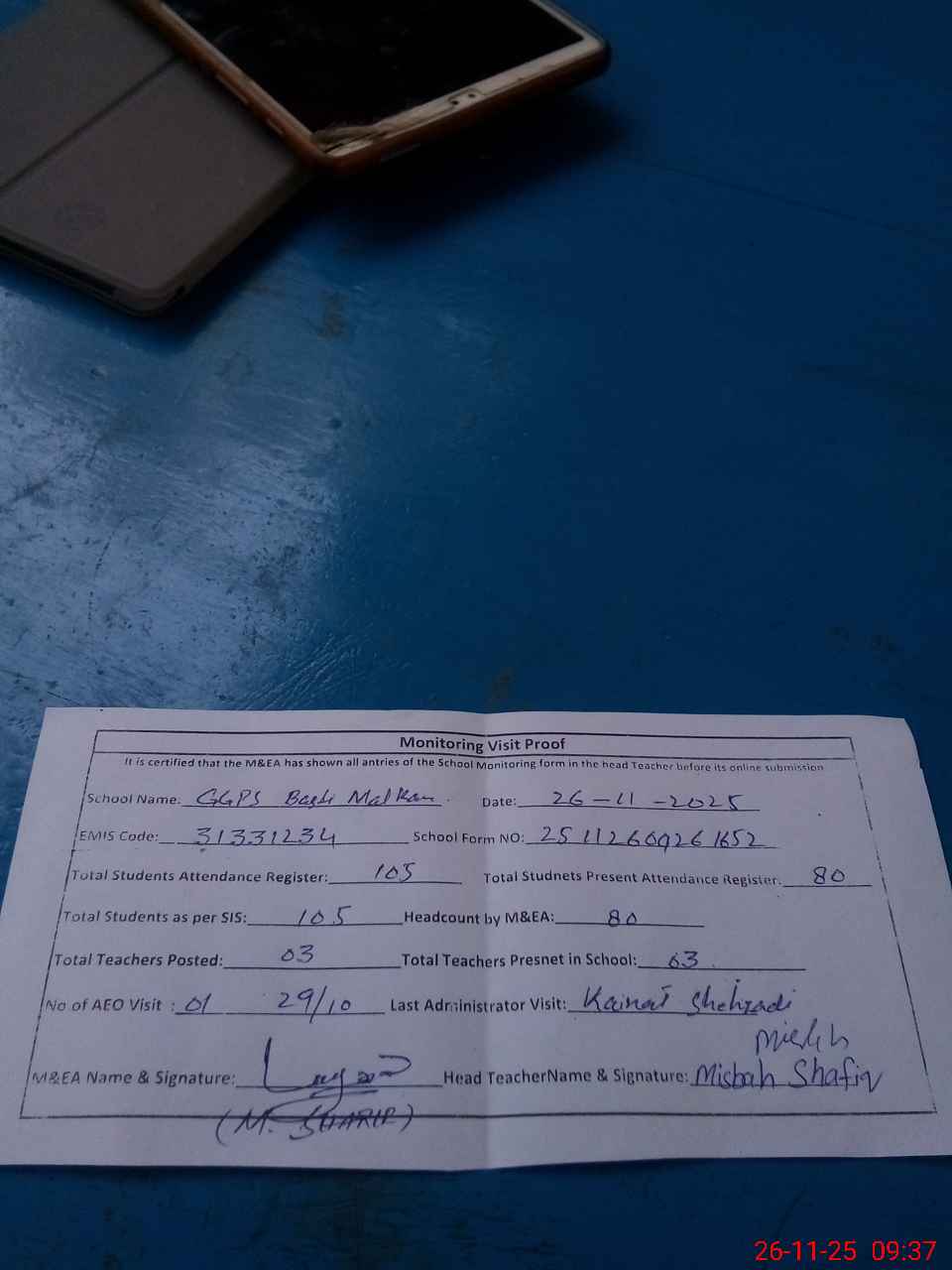 | Attendance Register | Head Teacher | MEA with School | Visit Proof |