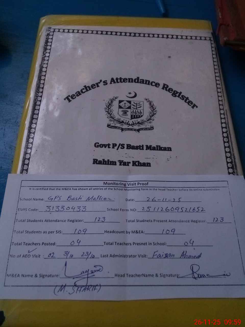 | Attendance Register | Head Teacher | MEA with School | Visit Proof |