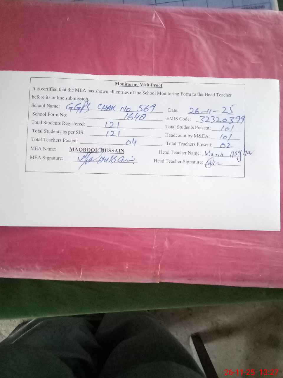 | Attendance Register | Head Teacher | MEA with School | Visit Proof |