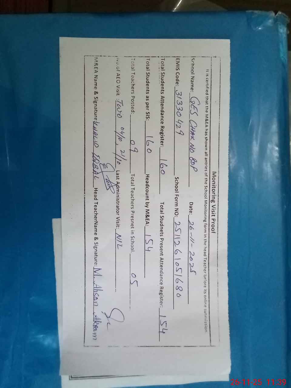 | Attendance Register | Head Teacher | MEA with School | Visit Proof |