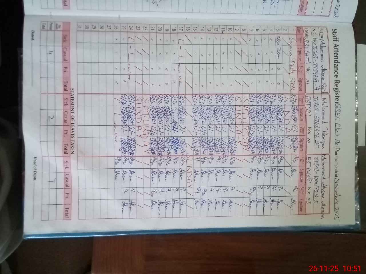 | CNIC | Full Name | Designation | R/C | Absence During Last Calender Month |