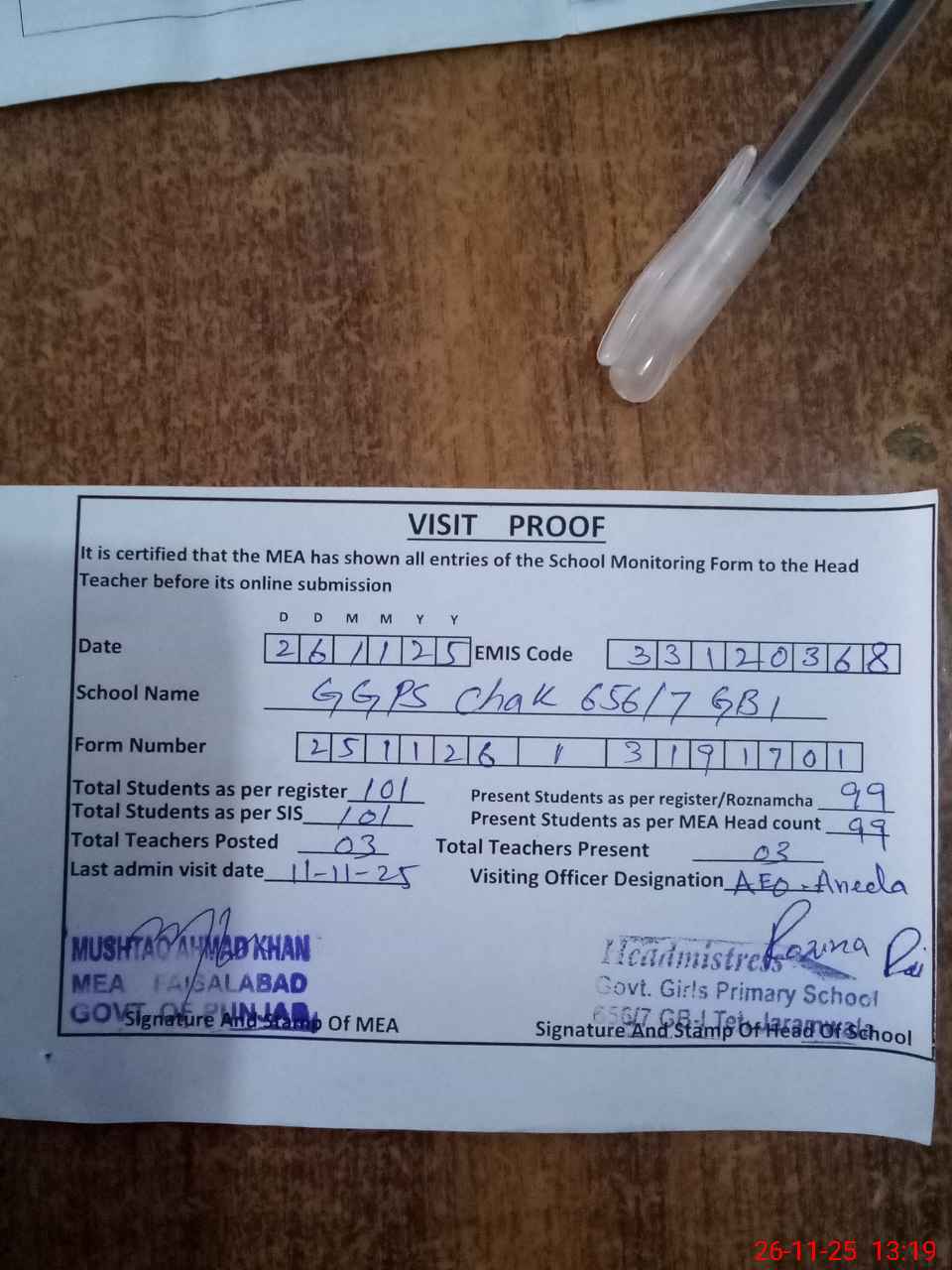 | EMIS Code: 33120368 | Name of School: GGPS CHAK 656/7 GB I JARANWALA | |||