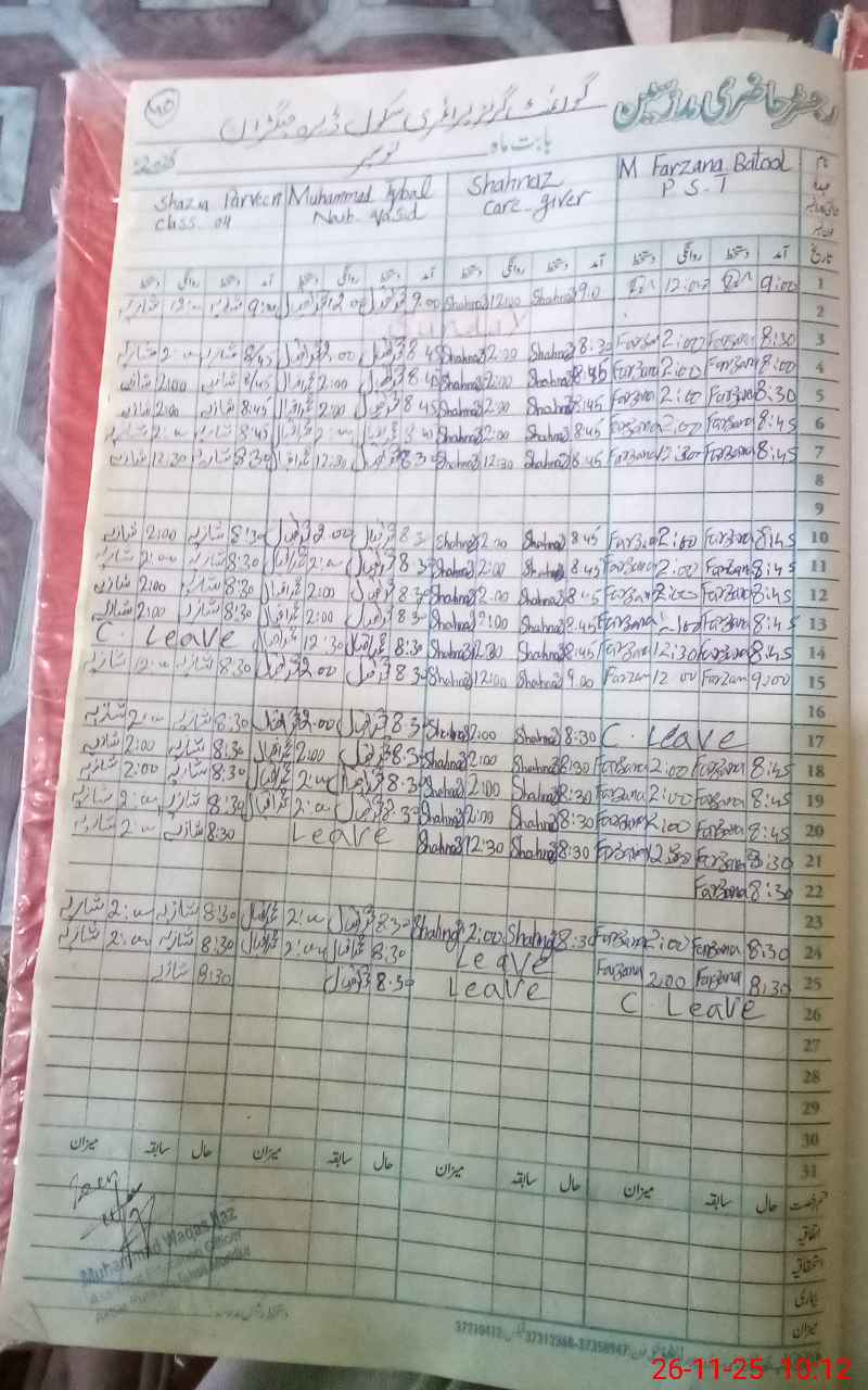 | CNIC | Full Name | Designation | R/C | Absence During Last Calender Month |