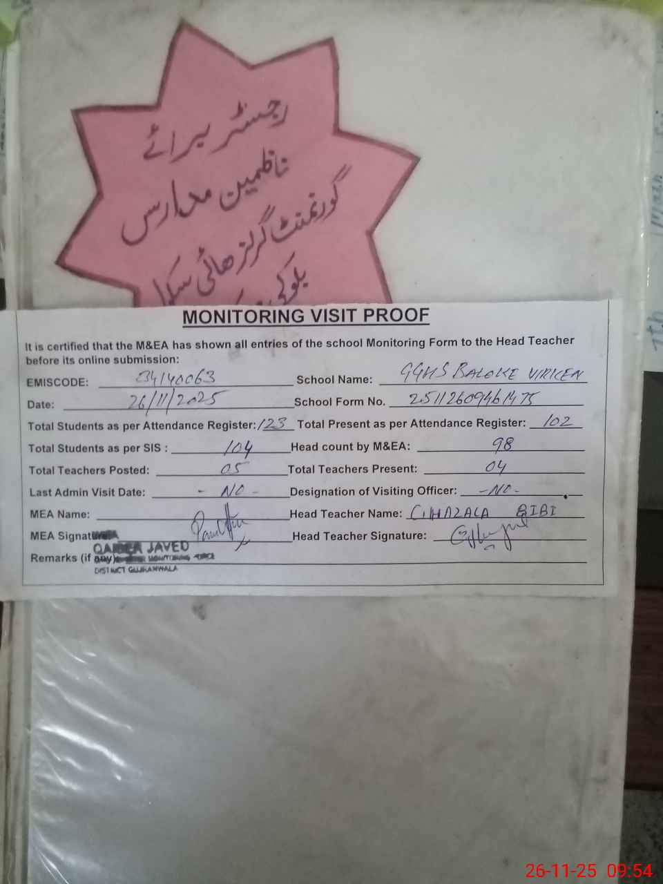 | Attendance Register | Head Teacher | MEA with School | Visit Proof |