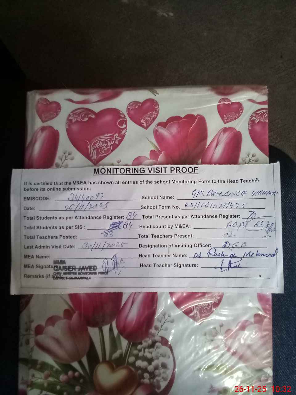 | Attendance Register | Head Teacher | MEA with School | Visit Proof |