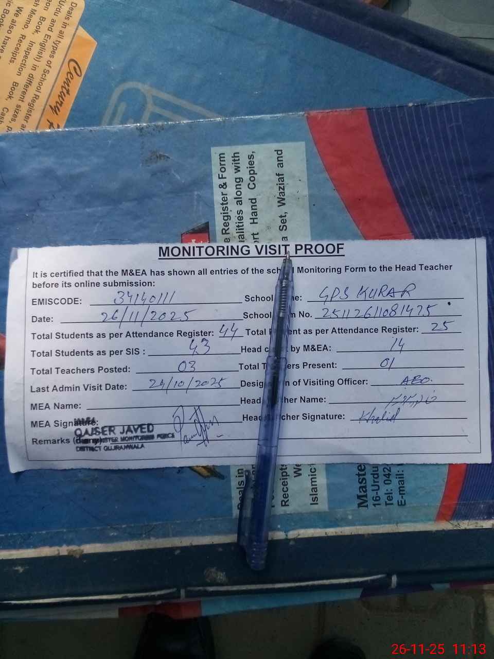 | Attendance Register | Head Teacher | MEA with School | Visit Proof |