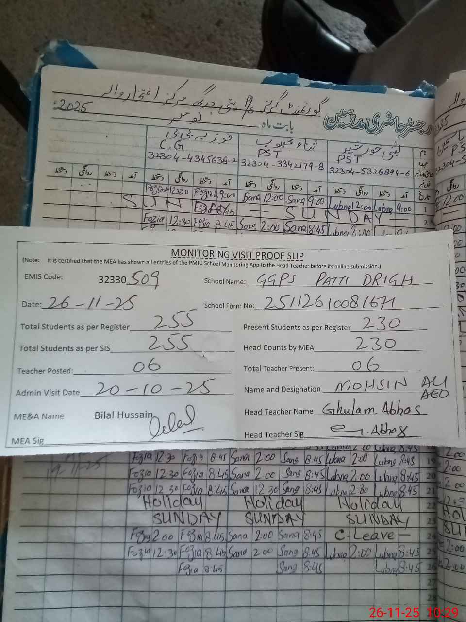 | Attendance Register | Head Teacher | MEA with School | Visit Proof |