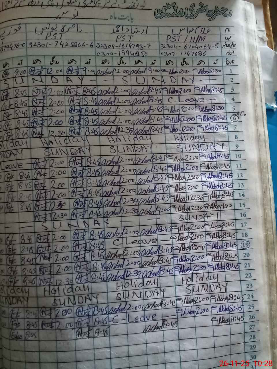 | CNIC | Full Name | Designation | R/C | Absence During Last Calender Month |