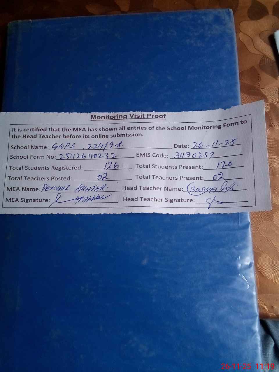 | Attendance Register | Head Teacher | MEA with School | Visit Proof |