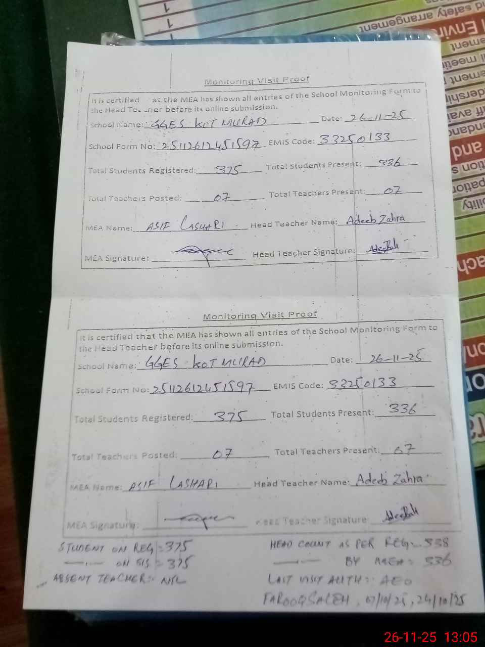 | EMIS Code: 33250133 | Name of School: GGES KOT MURAD | |||