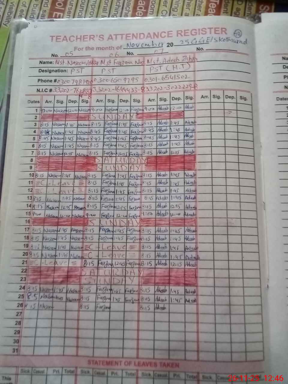 | CNIC | Full Name | Designation | R/C | Absence During Last Calender Month |