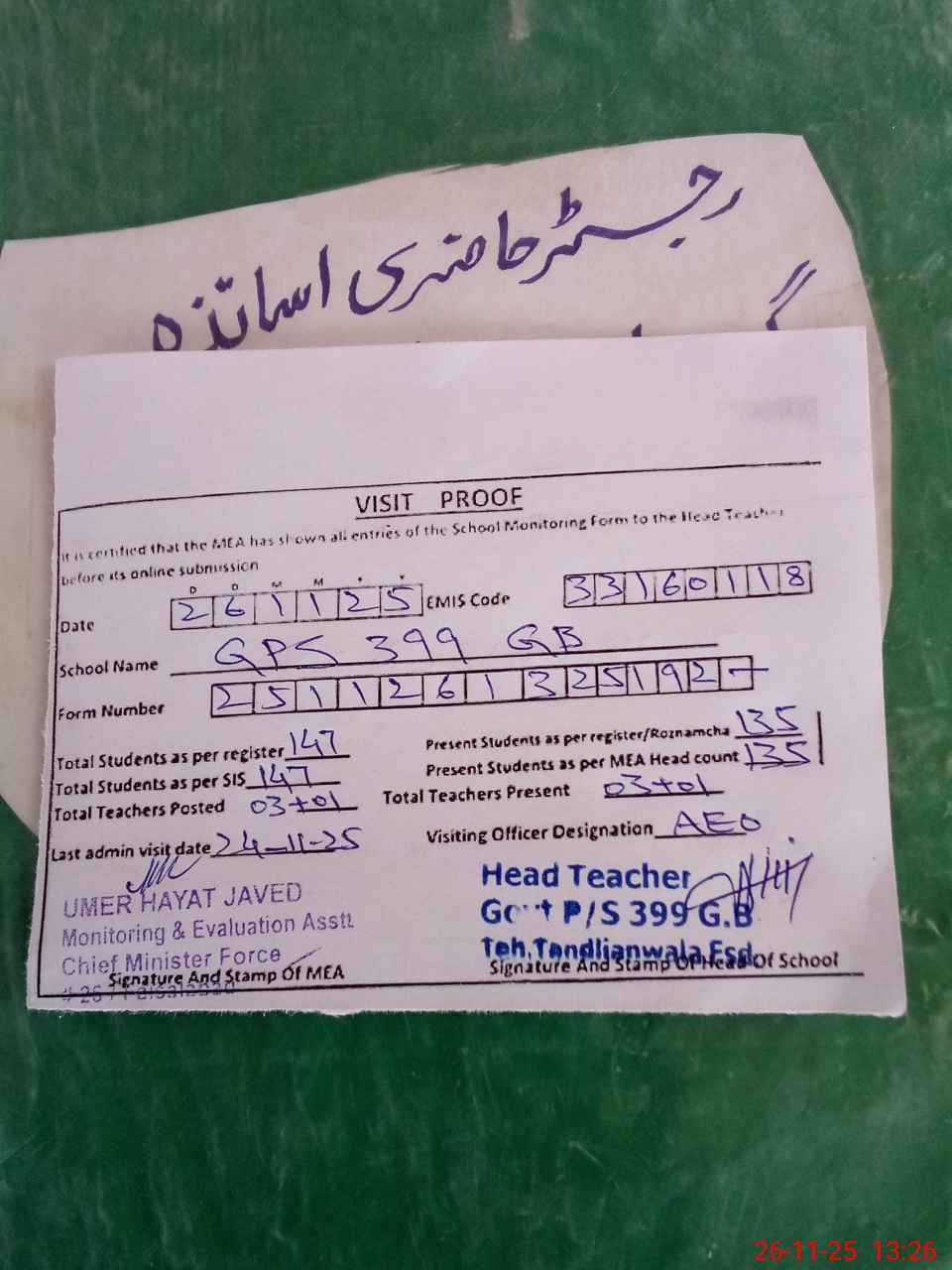 | EMIS Code: 33160118 | Name of School: GPS CHAK 399 GB I TANDLIANWALA | |||