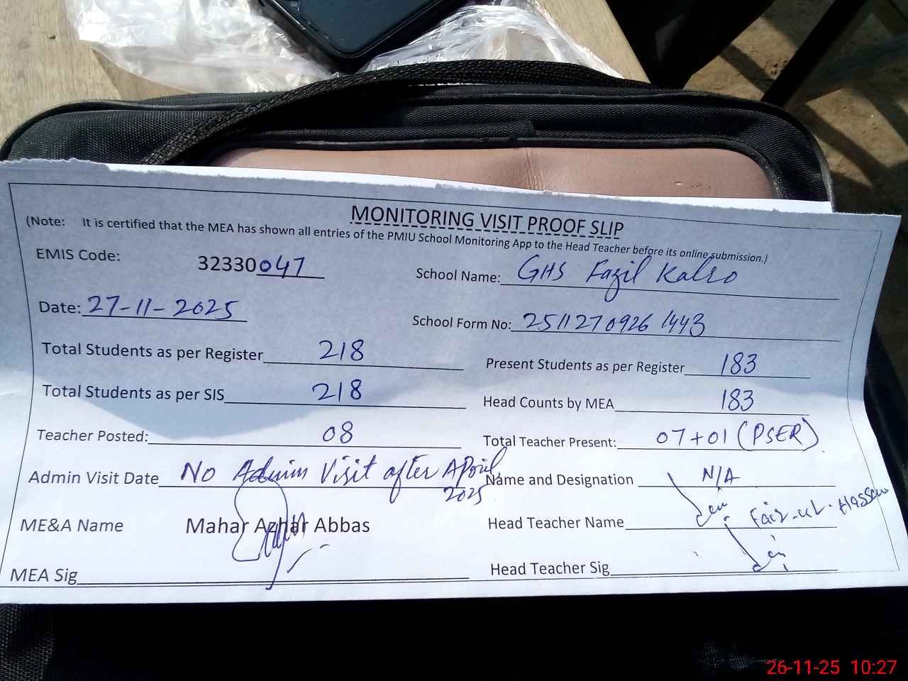 | Remarks (Use Separate Page if Required): No admin visit after April, 2025 NSB and FTF record not available in school as Headmaster of GHS Basira Mr. Abdul Hameed posses DDO power and record is also held with him. | |||||