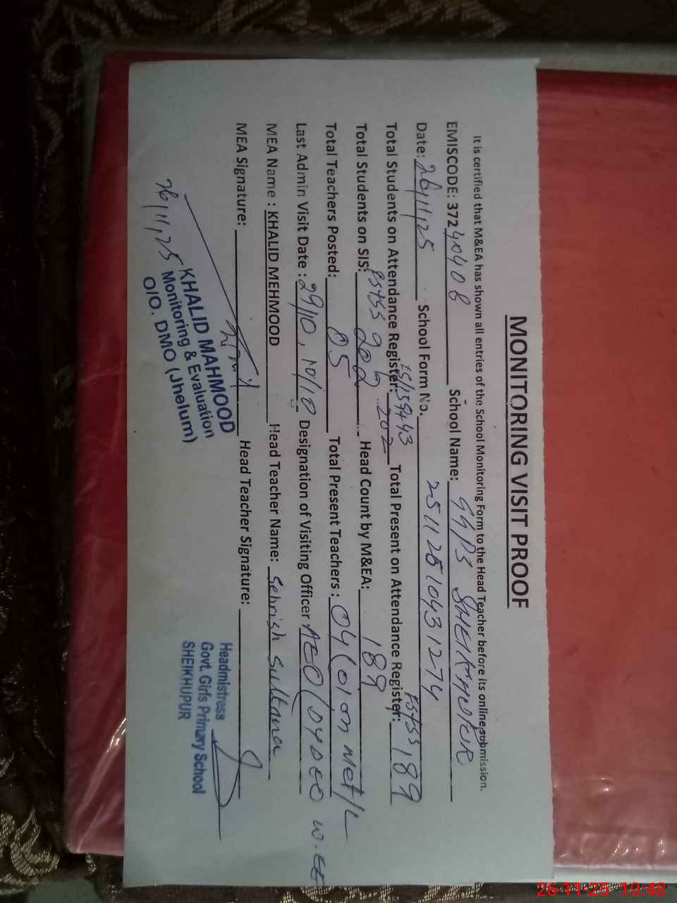 | Certified that this School was Inspected by the Undersigned MEA/DMO Today and the Information Stated Above is as Per Record. | |||||