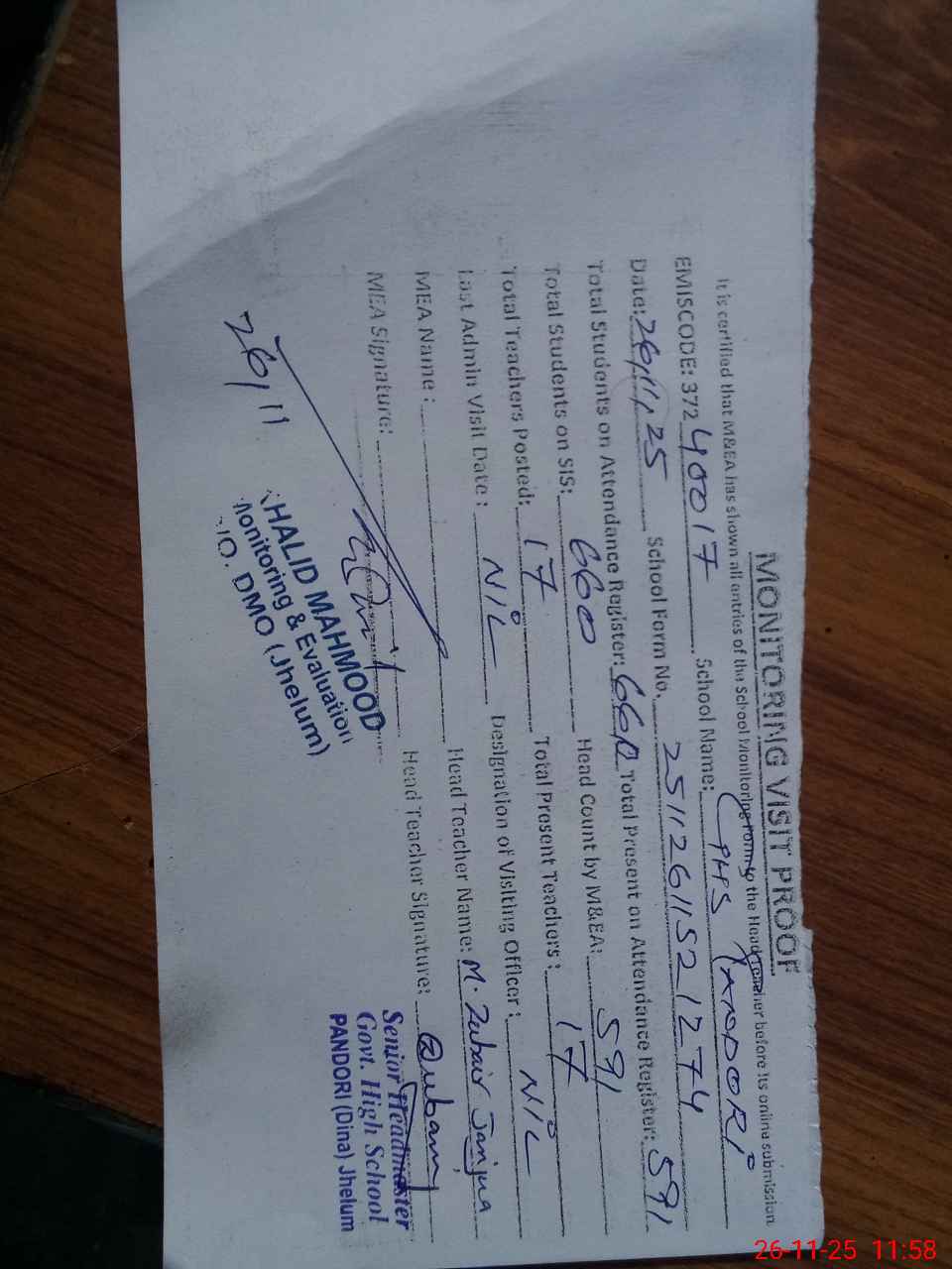 | Attendance Register | Head Teacher | MEA with School | Visit Proof |