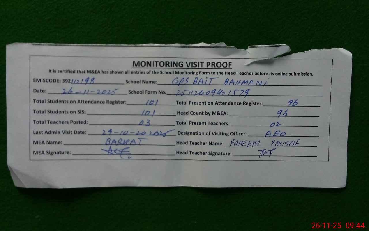 | EMIS Code: 39210198 | Name of School: GPS BAIT BAHMANI | |||