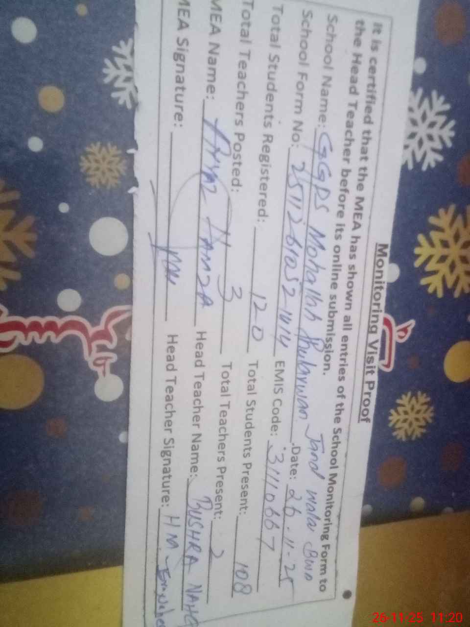 | Monitoring Date: 26-11-2025 | Start Time: 26-11-2025 10:52 AM | End Time: 26-11-2025 11:21 AM | Name of MEA: M.**** HA**** BN**** | |