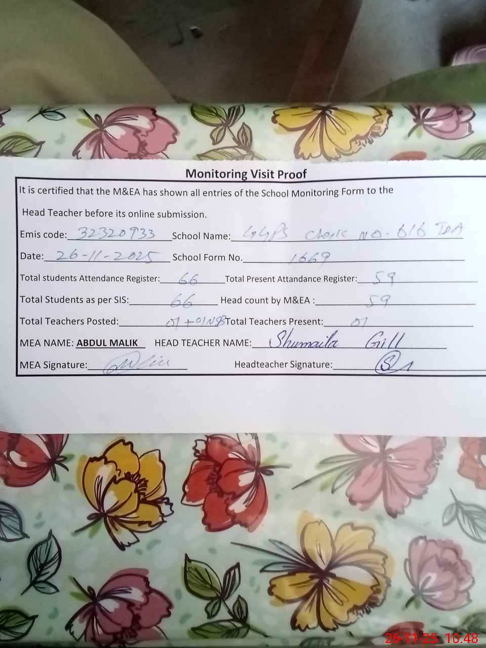 | EMIS Code: 32320933 | Name of School: GGPS CHAK NO. 616 TDA | |||