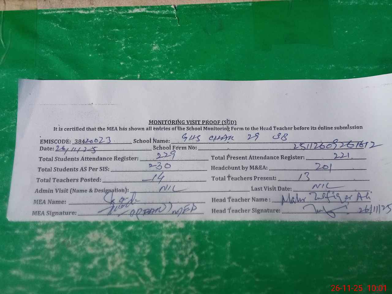 | Attendance Register | Head Teacher | MEA with School | Visit Proof |