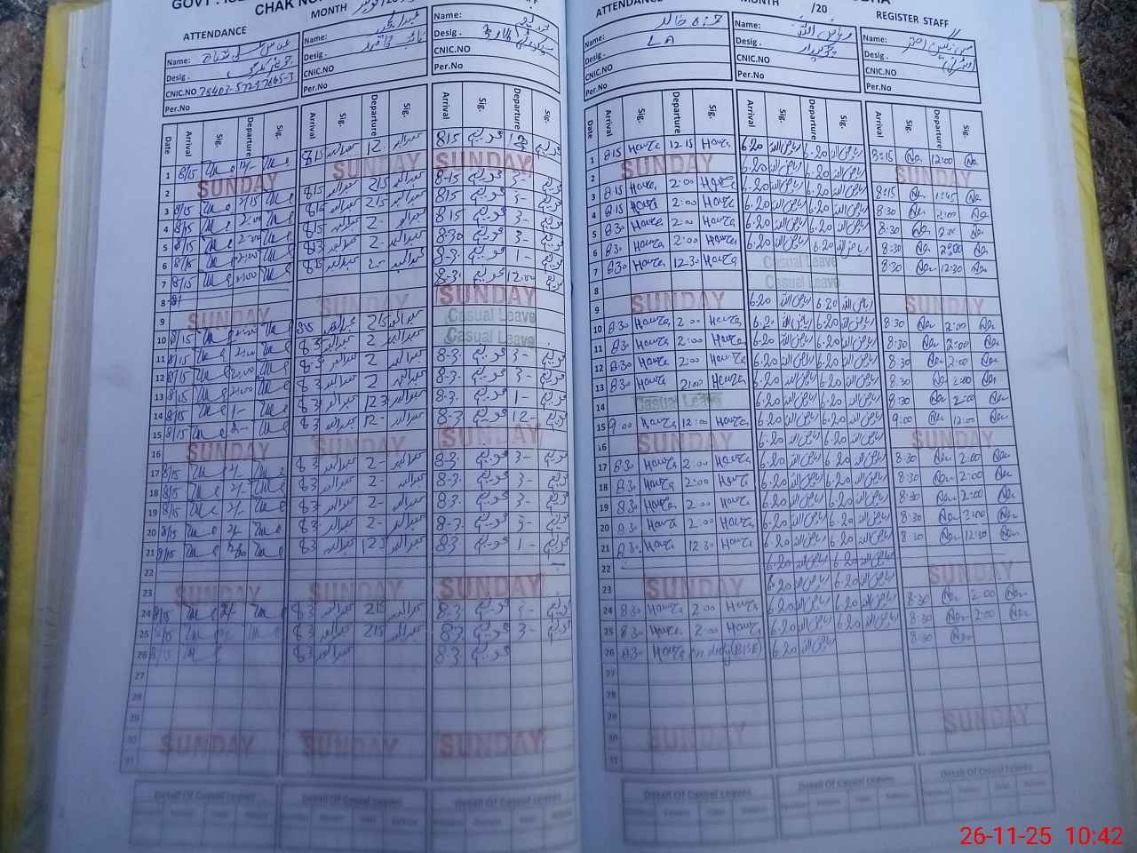 | CNIC | Full Name | Designation | R/C | Absence During Last Calender Month |