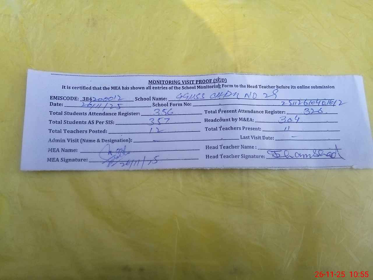 | Attendance Register | Head Teacher | MEA with School | Visit Proof |