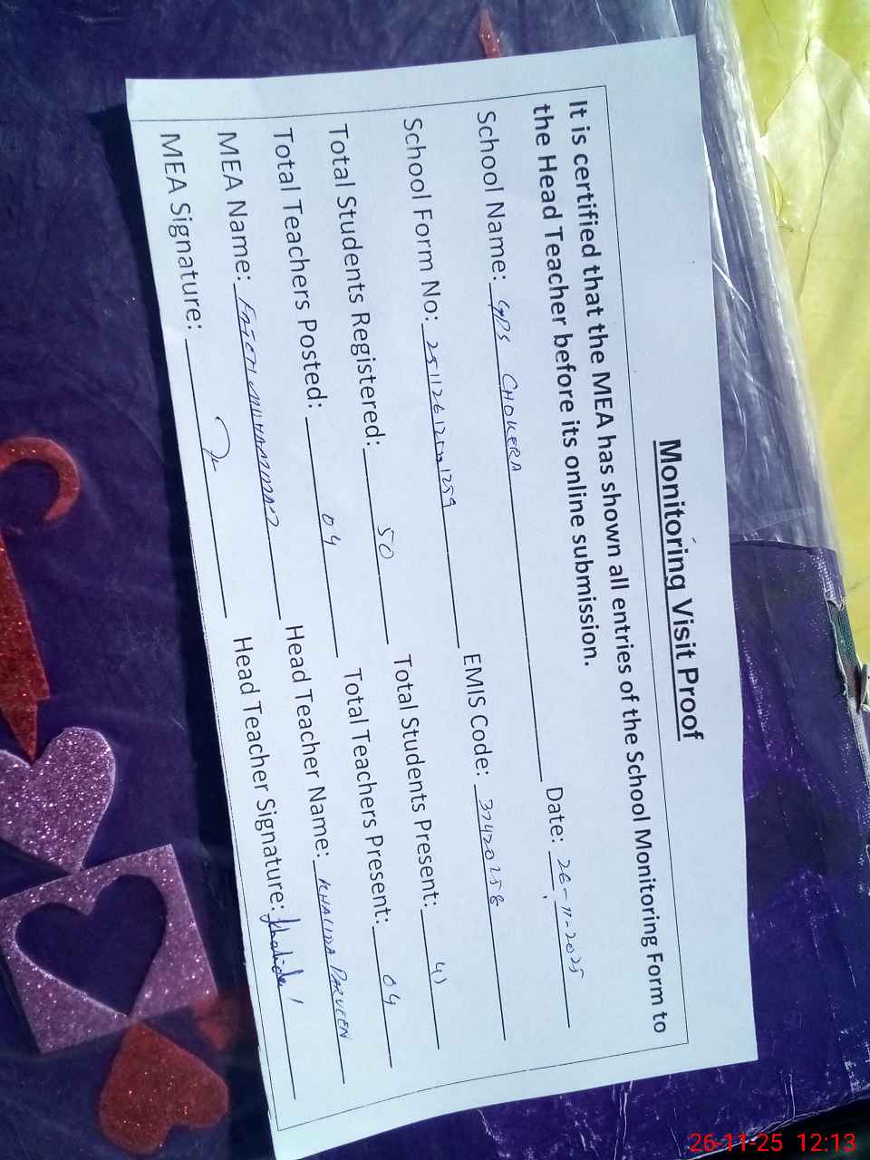 | Attendance Register | Head Teacher | MEA with School | Visit Proof |