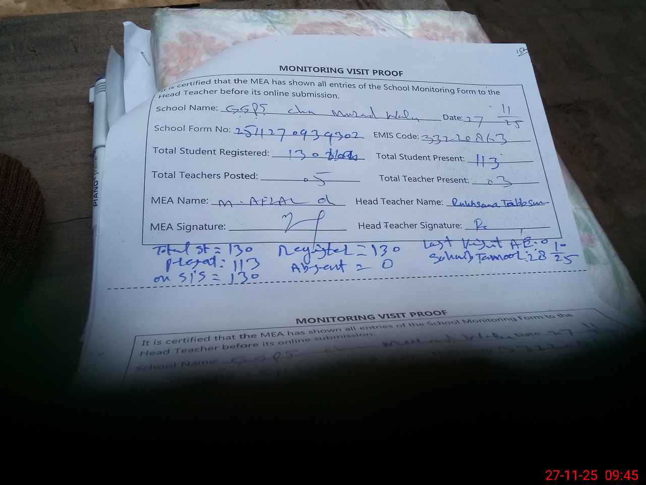 | Attendance Register | Head Teacher | MEA with School | Visit Proof |