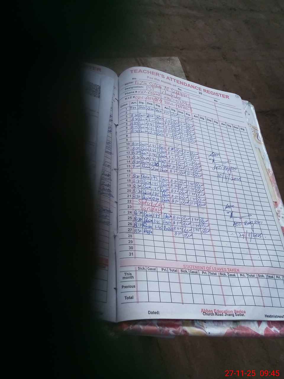 | Name: KH**** PE**** Designation: (School Headmaster's/Headmistress's) PST Phone/Cell Number: 03**** |