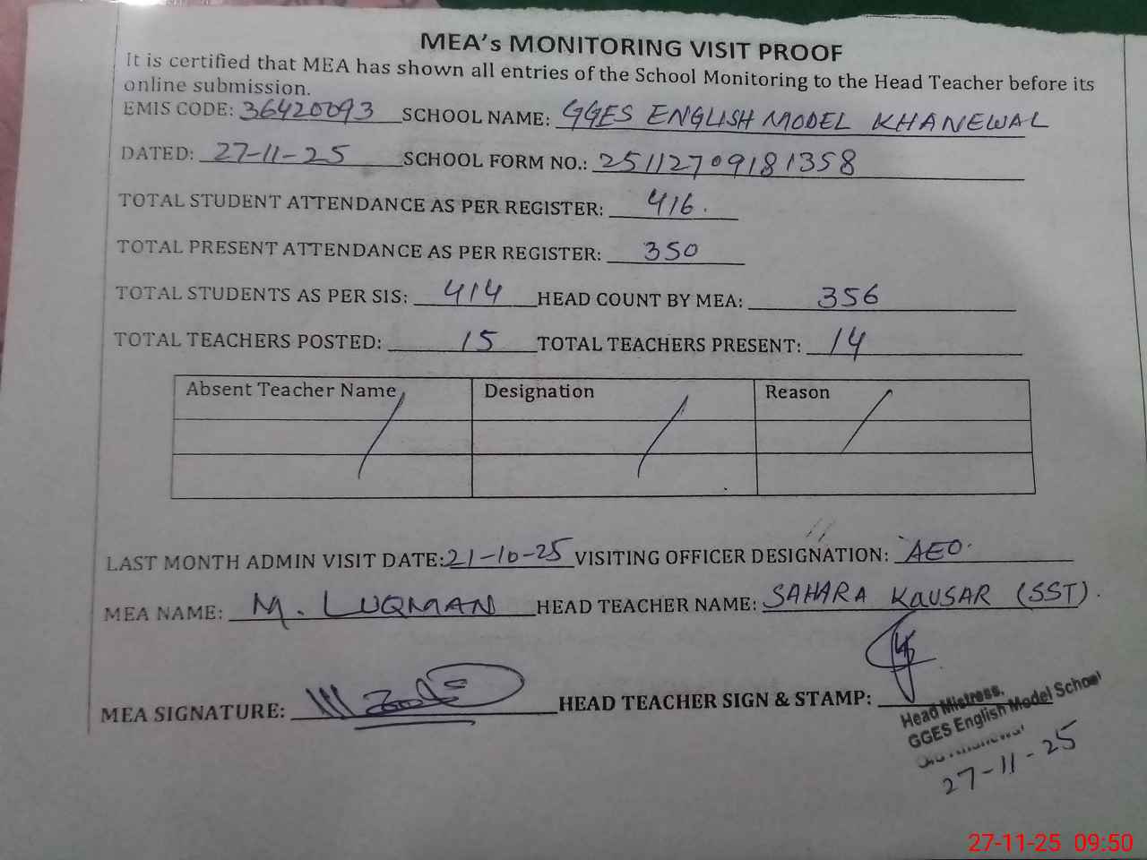 | Attendance Register | Head Teacher | MEA with School | Visit Proof |