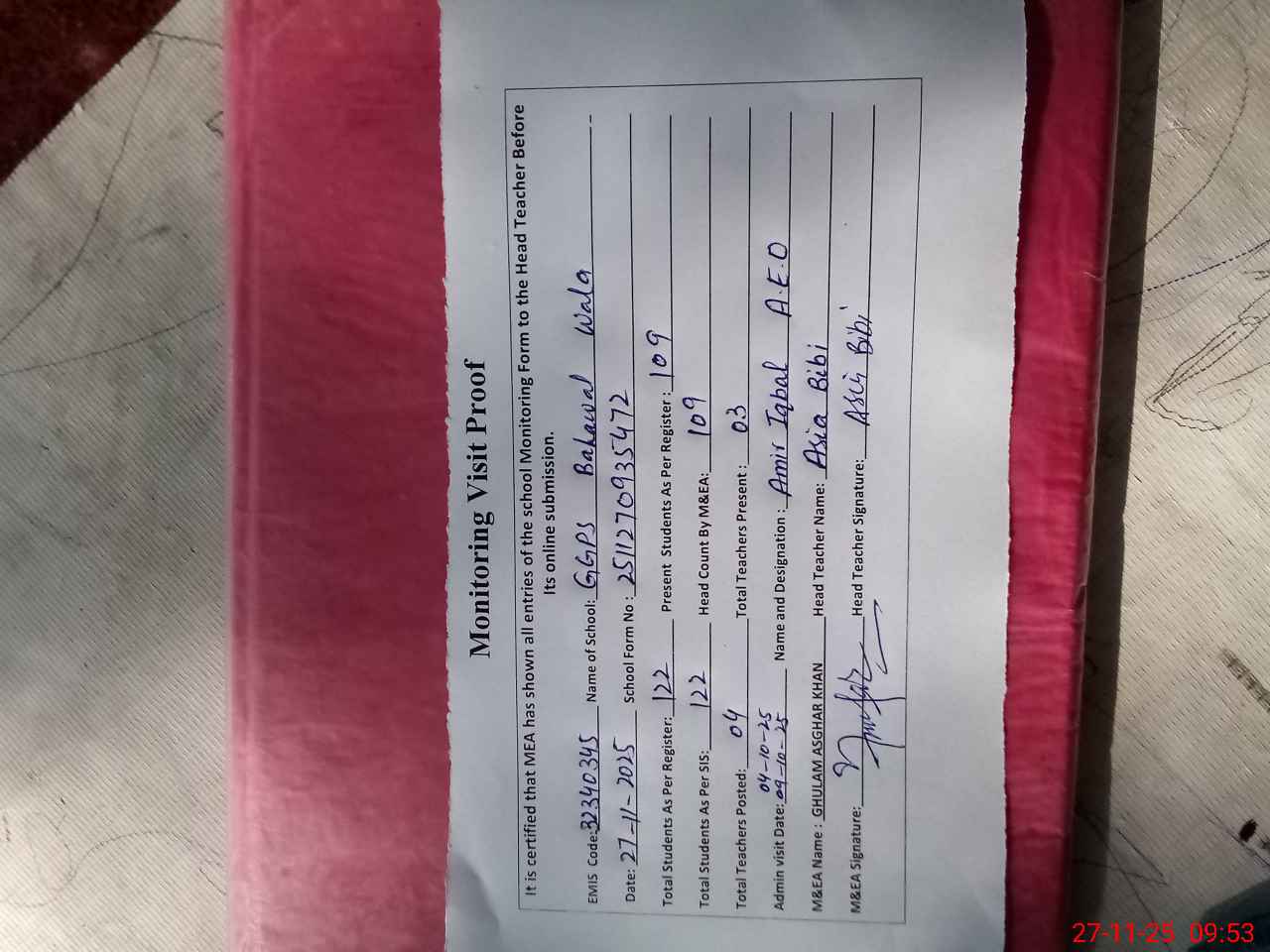 | Attendance Register | Head Teacher | MEA with School | Visit Proof |