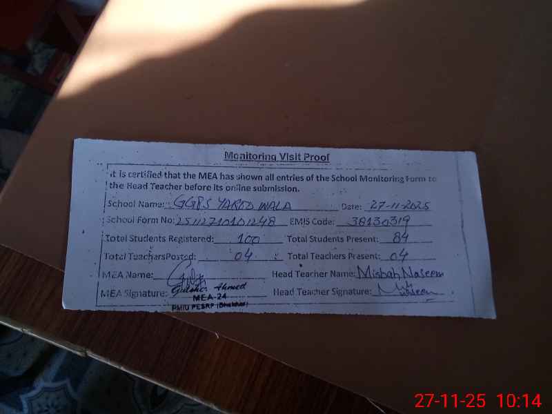 | EMIS Code: 38130319 | Name of School: GGPS YAROO WALA | |||