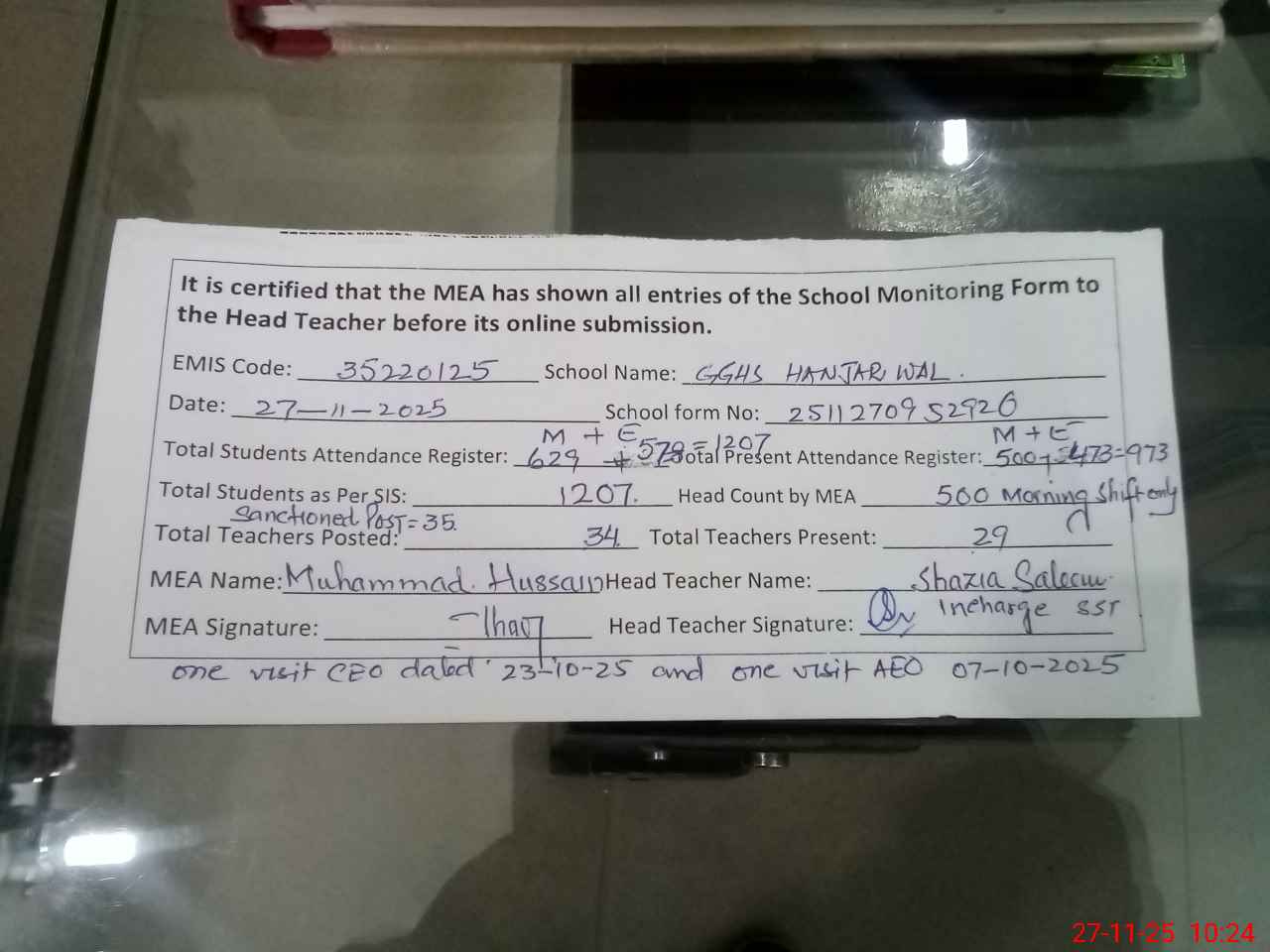 | Remarks (Use Separate Page if Required): 1 ECE class room established and students also enrolled but ECE class students coming in school second shift but no column for ECE students in second shift so ECE students data entered in morning shift column from second shift roznamcha of previous day 2 In ECE class room morning time 10th class students sitting due to shortages of class rooms | |||||