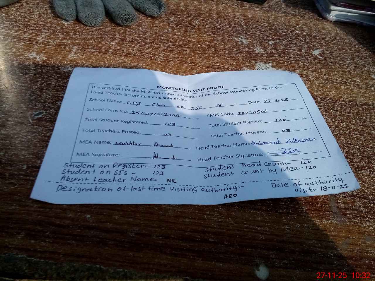 | Attendance Register | Head Teacher | MEA with School | Visit Proof |
