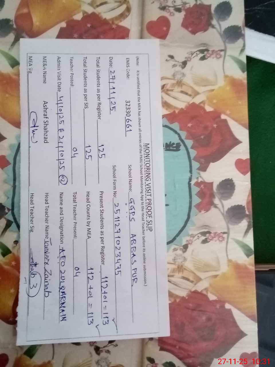 | EMIS Code: 32330661 | Name of School: GGPS ABBAS PUR | |||
