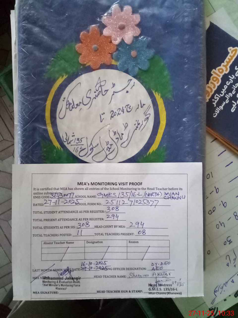 | Attendance Register | Head Teacher | MEA with School | Visit Proof |