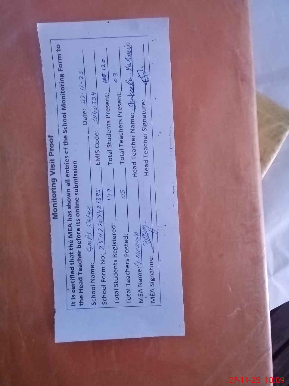 | Attendance Register | Head Teacher | MEA with School | Visit Proof |