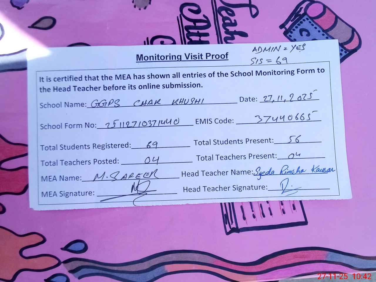 | EMIS Code: 37440665 | Name of School: GGPS CHAK KHUSH | |||