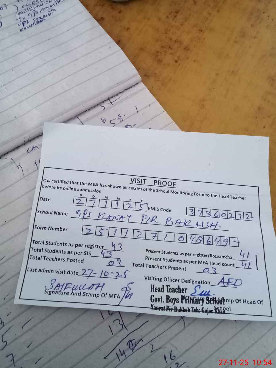 | Attendance Register | Head Teacher | MEA with School | Visit Proof |