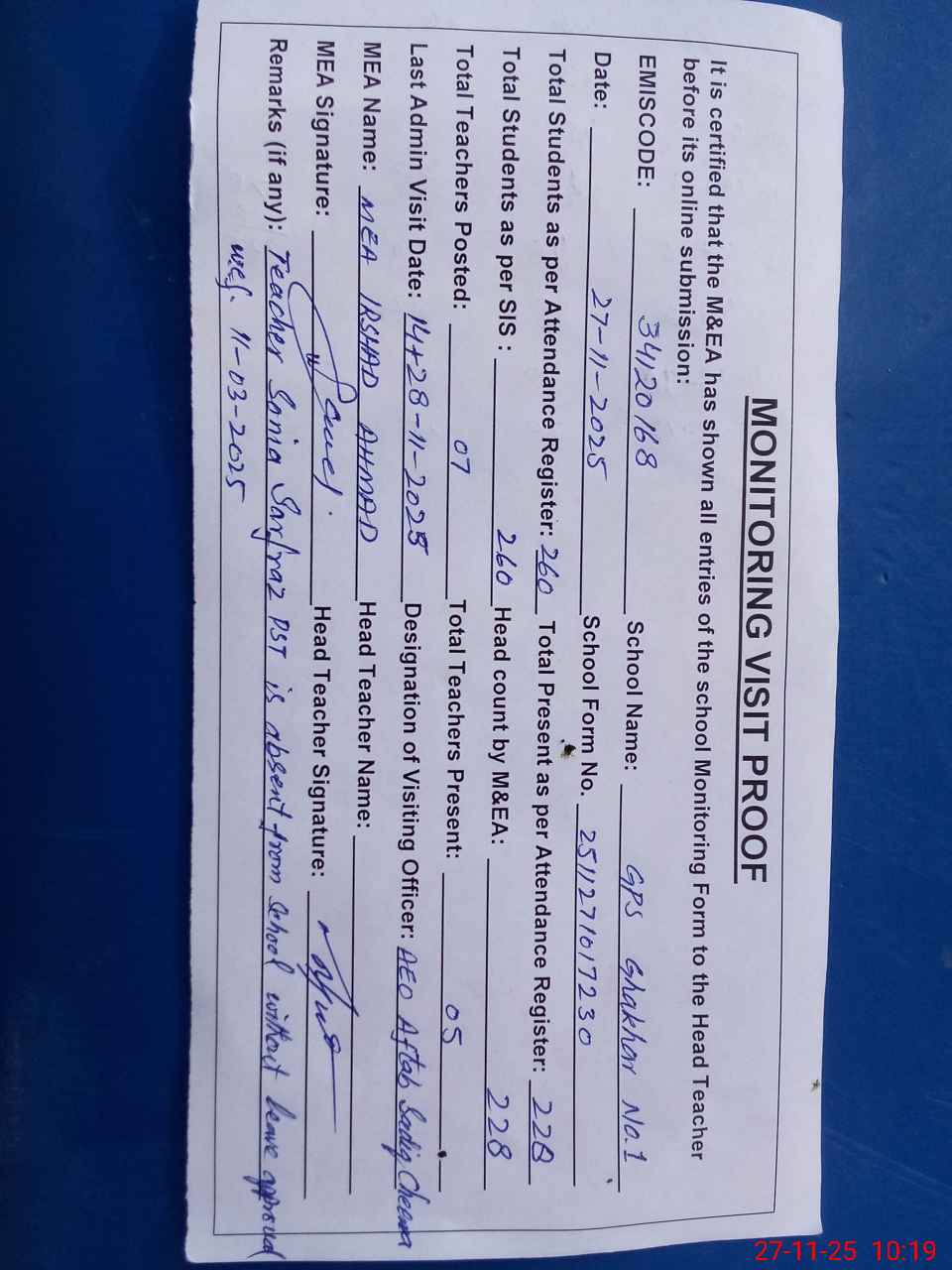 | Attendance Register | Head Teacher | MEA with School | Visit Proof |