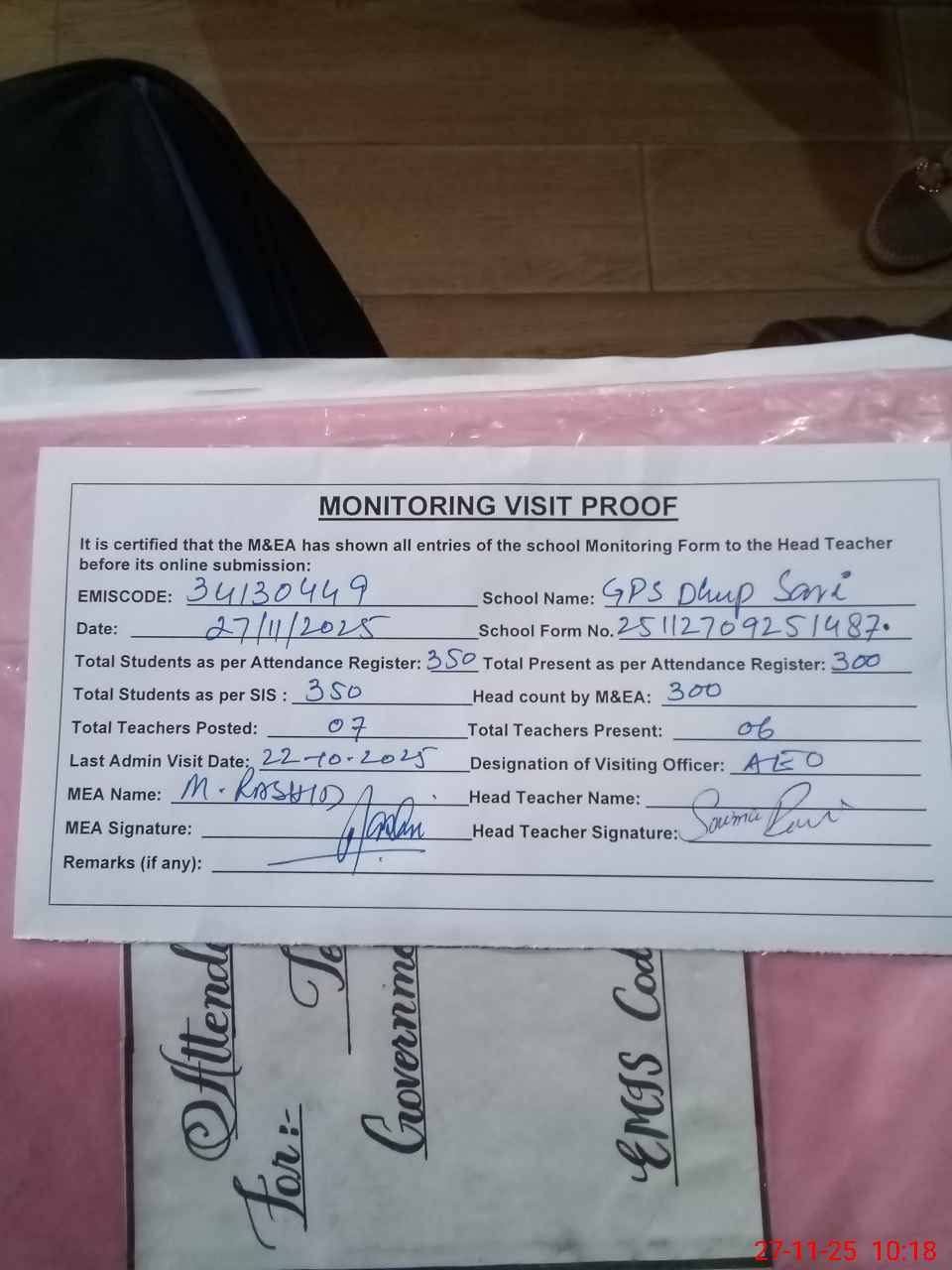| Attendance Register | Head Teacher | MEA with School | Visit Proof |