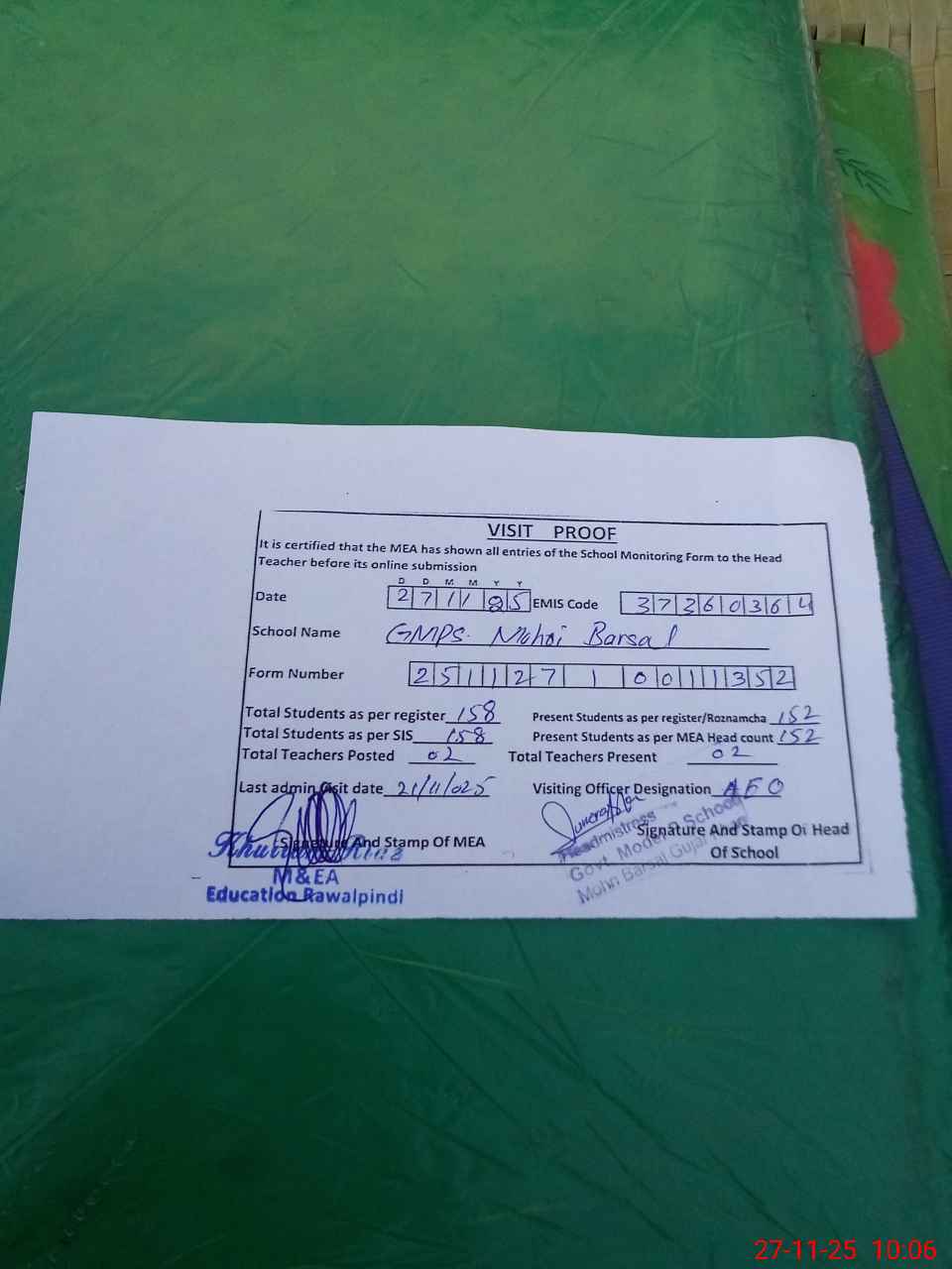 | Attendance Register | Head Teacher | MEA with School | Visit Proof |